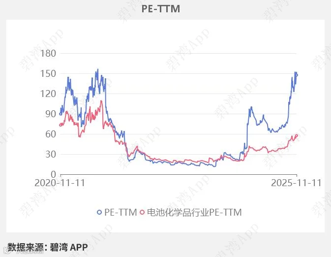 在2025年11月11日,天赐材料的PE-TTM是147.40,而电池化学品行业的PE-TTM是57.53,天赐材料的PE-TTM远高于电池化学品行业的PE-TTM。