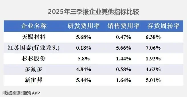 上图5家公司在研发上,杉杉股份以5.8%的研发费用率排最高,最低的是江苏国泰,研发费用率为0.18%。