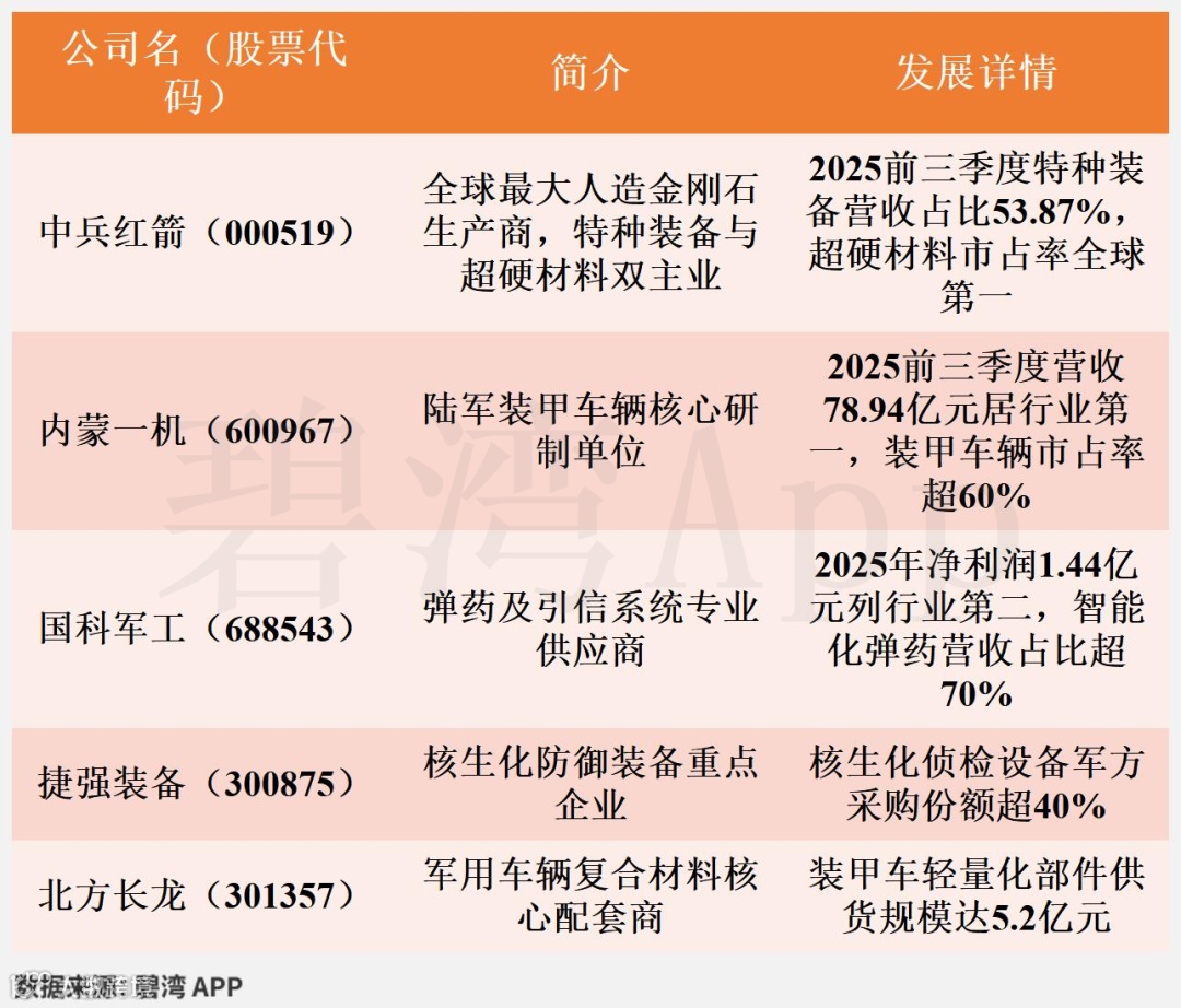 中兵红箭为国内地面兵装行业营收第二的企业,2025年前三季度营收34.24亿元(行业排名2/12),超硬材料全球市占率超35%居首位,但特种装备业务营收占比53.87%仍为核心支柱,净利润受军品定价机制影响持续承压。