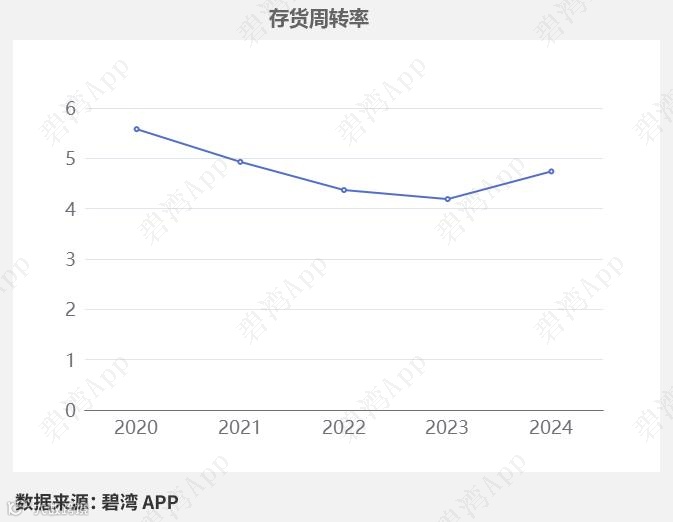 2024年企业存货周转率为4.74,在2023年到2024年中京电子存货周转率从4.19小幅提升到了4.74,存货周转天数从85天减少到了75天。2024年中京电子存货余额合计6.39亿元,占总资产的10.72%,同比去年的5.98亿元小幅增长6.75%。