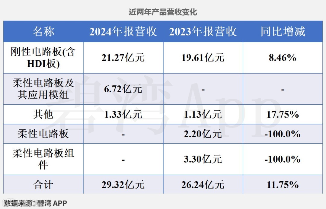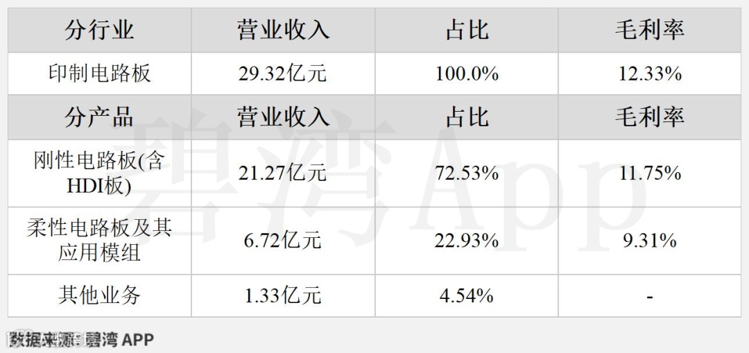 公司的主营业务为印制电路板,主要产品包括刚性电路板(含HDI板)和柔性电路板及其应用模组两项,其中刚性电路板(含HDI板)占比72.53%,柔性电路板及其应用模组占比22.93%。