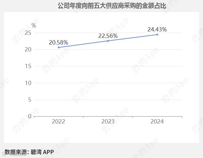 从2022年至今,公司年度向前五大供应商采购的金额占比整体持续增长,从2022年的20.58%上升至2024年的24.43%。