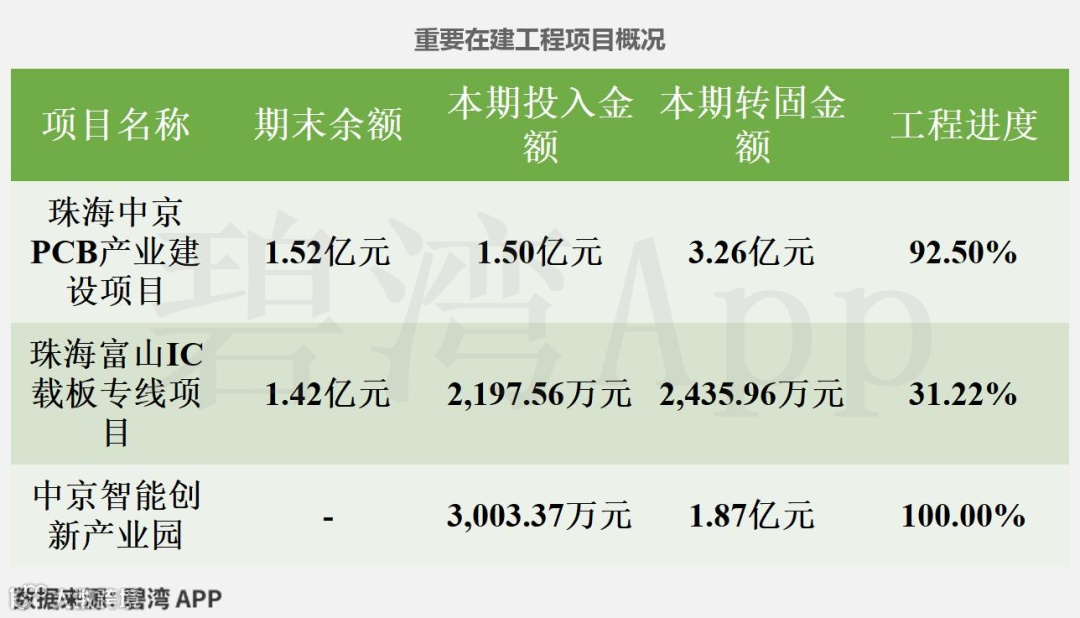 在此之中:珠海中京PCB产业建设项目转入3.26亿元。