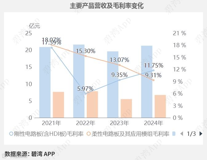 值得一提的是,刚性电路板(含HDI板)在营收额增长的同时,而且毛利率也在提升。2022-2024年刚性电路板(含HDI板)毛利率呈大幅增长趋势,从2022年的5.97%,大幅增长到2024年的11.75%,2020-2024年柔性电路板及其应用模组毛利率呈大幅下降趋势,从2020年的23.90%,大幅下降到2024年的9.31%。