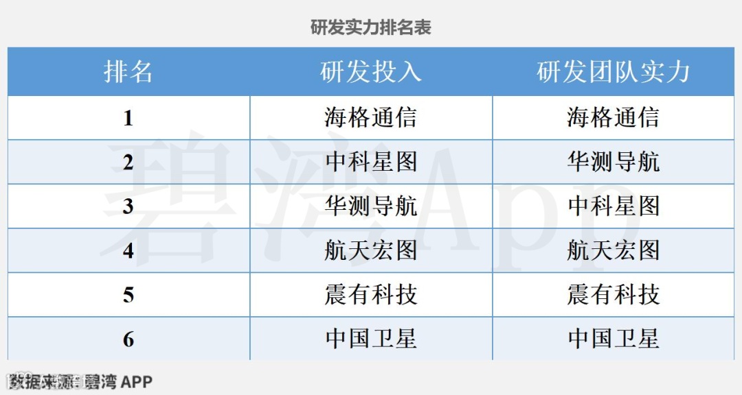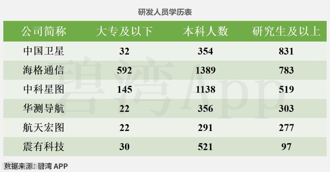 根据中科星图(688568)、华测导航(300627)、海格通信(002465)、震有科技(688418)、航天宏图(688066)、中国卫星(600118)公开披露数据,对6家公司的研发实力信息等数据统计如下。