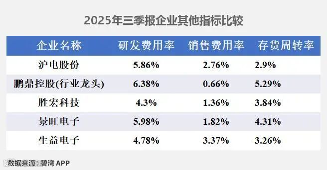 上图5家公司在研发上,鹏鼎控股以6.38%的研发费用率排最高,最低的是胜宏科技,研发费用率为4.3%。