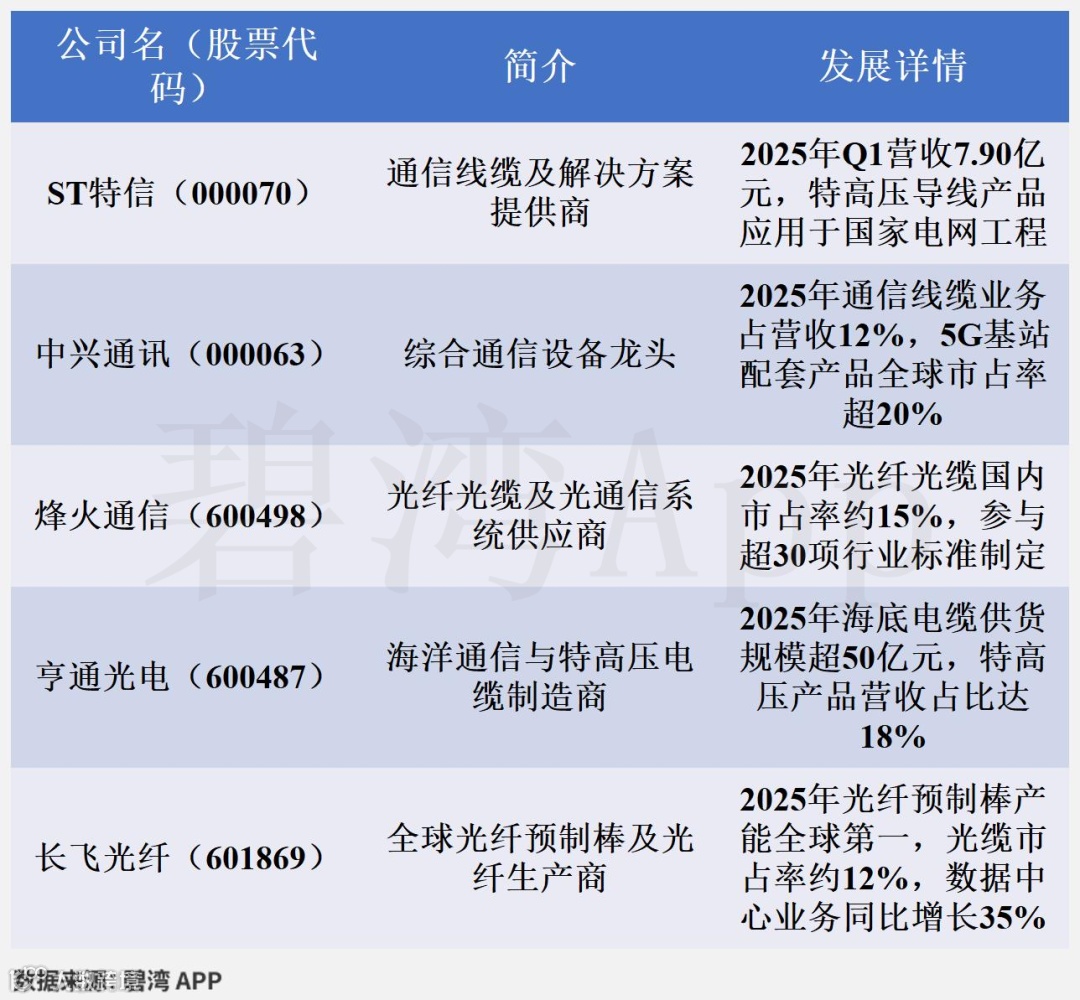 ST特信是国内通信线缆及配套领域技术领军企业,主导特高压OPGW等产品研发,在特高压工程及智慧监测系统领域具备差异化优势,2025年一季度营收规模居细分赛道前五,市占率约3%-4%。