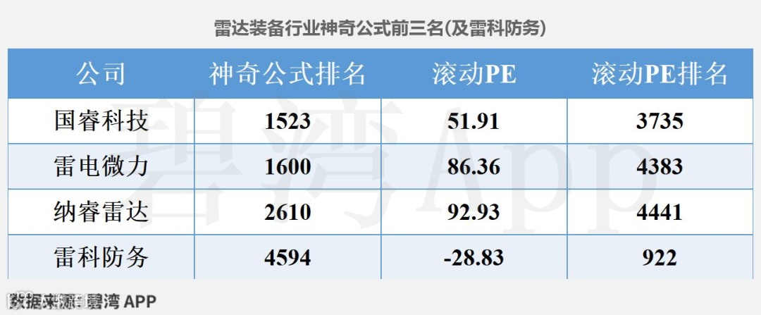 可以看到,近期雷科防务PE-TTM为负,参考价值不大。