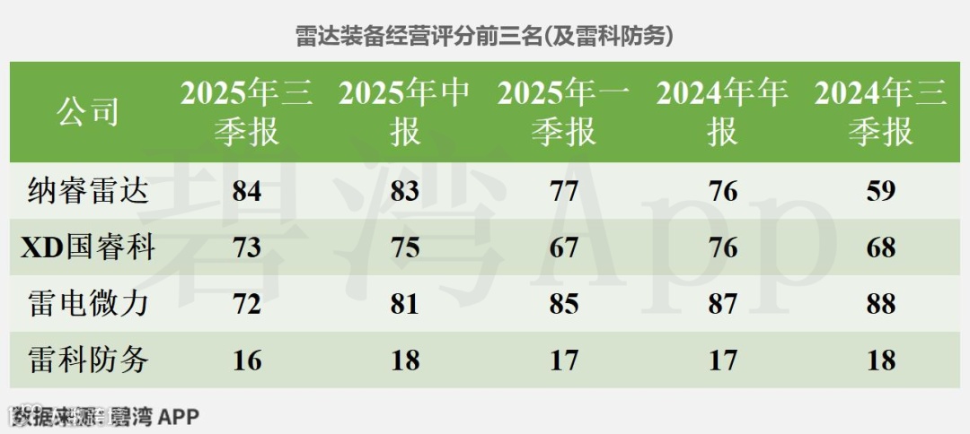 雷科防务在2025年三季报经营评分排名为第4299名,在雷达装备行业中排名为7名。