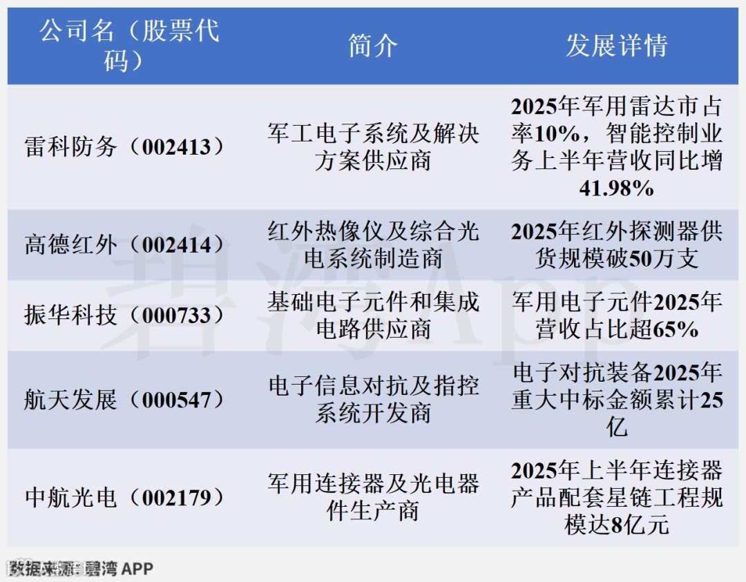 雷科防务在军工电子领域处于第二梯队,2025年军用雷达市场占有率约10%,其毫米波雷达、星载SAR成像处理芯片等技术具备竞争优势,卫星应用和智能控制业务营收占比分别达18.4%、26.1%,智能控制业务2025年上半年营收同比增长41.98%。