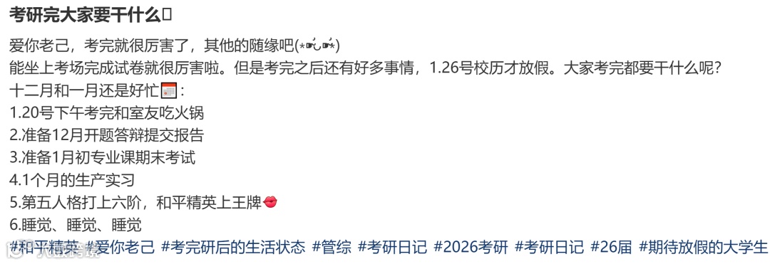 考研不仅是脑力战,也是一场体力战,现在疲惫的身体和精神都需要好好休息。做一些长久以来压抑的想法:积攒的小小脂肪、卸载的娱乐软件、搁置的快乐计划。