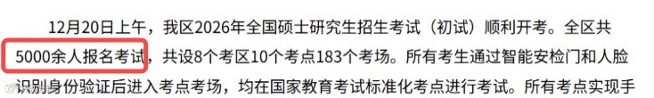 全区共7.59万名考生报名参加考试,较25考研(7.57万人)增加0.02W,增幅0.26%。