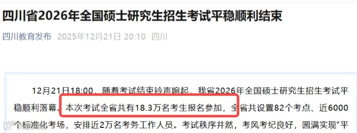 本次考试全省共有18.3万名考生报名参加,全省共设置82个考点、近6000个标准化考场。较25考研(20.8万人)减少2.5W,降幅12%。
