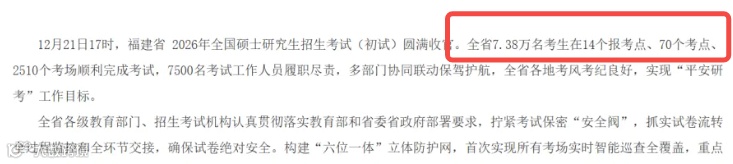 全省7.38万名考生在14个报考点、70个考点、2510个考场顺利完成考试。较25考研(8.2万人)减少0.82W,降幅10%。