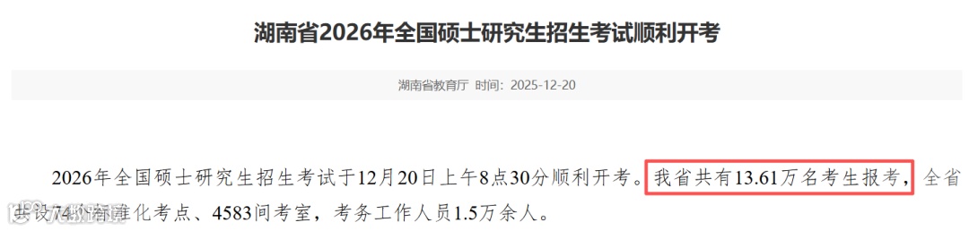 我省共有13.61万名考生报考,全省共设74个标准化考点、4583间考室,考务工作人员1.5万余人。较25考研(14.92万人)减少1.31W,降幅8.78%。