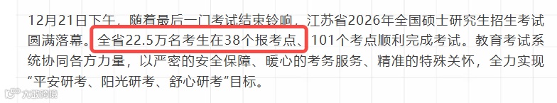 全省22.5万名考生在38个报考点、101个考点顺利完成考试。较25考研(25.2万人)减少2.7W,降幅10.7%。