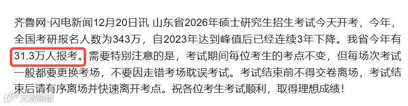 山东全省报名人数达到31.3万人,较25考研(35.5万人)减少4.2W,降幅11.8%。