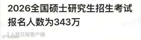 2026年全国硕士研究生招生考试报名人数为343万。这一数据,相较25考研人数(388万)下降了45万人之多,降幅达到了11.59%,降幅超过去年的11.4%和前年的7.6%。