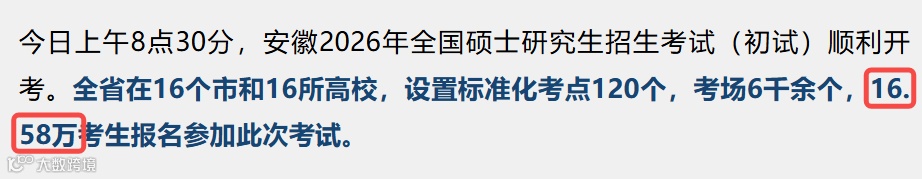 全省在16个市和16所高校,设置标准化考点120个,考场6千余个,16.58万考生报名参加此次考试。较25考研(18.83万人)减少2.25W,降幅11.9%。