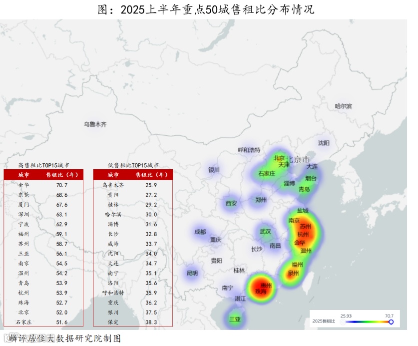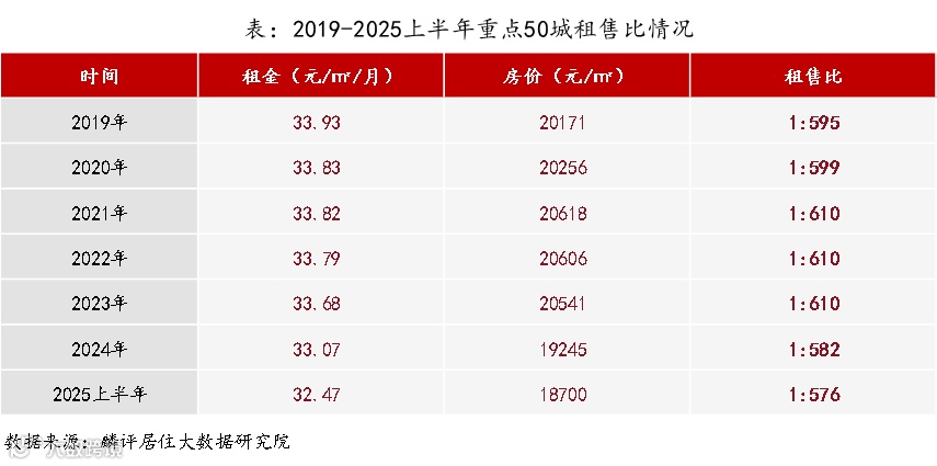 2025上半年全国50城租售比为1:576,房价与租金的偏离程度进一步缩小。租售比是通过租金与房价间的关系来衡量地区楼市运行是否良好,国际标准认为房地产运行状况良好的租售比通常为1:200到1:300。根据麟评居住大数据研究院监测的重点50城来看,2025上半年平均租售比为1:576,自2024年以来,在房价加速下跌的背景下,租金和房价的偏离程度持续缩小,但与国际合理区间进行对比当前租售比水平仍偏离国际合理区间,租售比仍有进一步优化的空间。