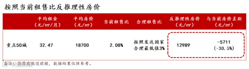房价底线梳理,一般而言,租售比对房价底线有一定参考作用,房子合理价值的底线是房租的贴现。也就是说,租金、合理租售比反推出来的房价水平是房地产市场运行的合理价值水平,国际经验租售比维持在3%-5%左右市场进入合理区间,房价将会是住房消费理性水平,国际有房产税的国家,合理的租售比是5%左右,中国目前还没实施房产税,按照发达国家合理最低值3%来计算,假设租金相对稳定,按照当前重点50城房价房租水平,房价跌至12989元/㎡左右为底线,当前房价与理性房价差5711元/㎡,相差幅度30.5%。