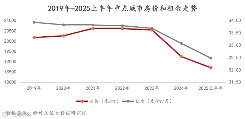 租售比与房价呈现负相关性。房价变化影响市场预期,居民存在买涨不买跌的心态,房价下行会影响市场信心,因为房价长期下跌会促进房价的加速下跌,而租金的变化由市场的真实住房需求决定,一般租金波动幅度较小,相对平稳。因此从房价和租售比的关系上看,房价与租售比呈现负相关性(如下图),2024年房价开始呈现明显的下行趋势,与此同时租售比提升,2025上半年继续该趋势仍未扭转。2025年尽管政策基调是促进房地产市场止跌回稳,但二手房市场仍在以价换量之中,一季度虽然价格跌幅收窄,二季度在市场需求走弱的带动下,房价加速下跌。