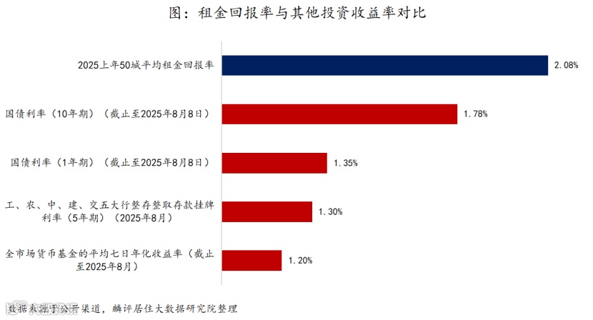 租金年回报率跑赢常见理财收益率。为加强资金的流动性,与国内LPR下调相呼应,存款利率和理财利率均处于历史低位,2025年8月,5年期银行存款利率为1.3%,10年国债利率1.78%,重点50城平均租金回报率赶超其他理财产品,买房收租的回报收益提升,根据麟评居住大数据研究院监测数据显示,2025年重点50城平均收益率达到了2.08%,领先于理财产品的利率。