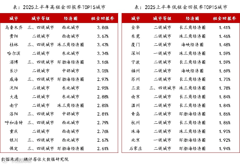低租金回报率城市则聚集主要聚集在长三角、珠三角、海峡经济圈,如金华租金回报率1.41%、东莞1.46%、厦门1.48%等,金华、东莞、厦门近年来租金回报率近年来一直处于低位水平,金华、东莞则是由于外溢住房需求导致的房价处于高位,租金处于低位,厦门则受到旅居地产的带动房价位居高位,租金相对较低。一线城市中,深圳租金回报率最低,其次是北京,再次是上海,广州。上海、广州租金回报率2025年上年年未进入TOP15排行榜。