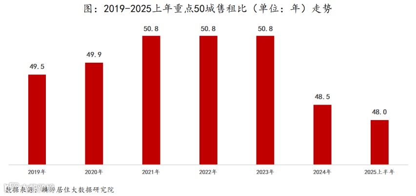 居民通过出租房产收回买房成本的年限继续缩短。根据麟评居住大数据研究院监测数据显示,2025上半年全国50大中城市售租比为48.0年,也就是说在不考虑转售的情况下,居民想要通过租金收回买房总成本需要48.0年的时间,较2023年缩短了0.5年,当前售租比处于2019年以来最低水平。