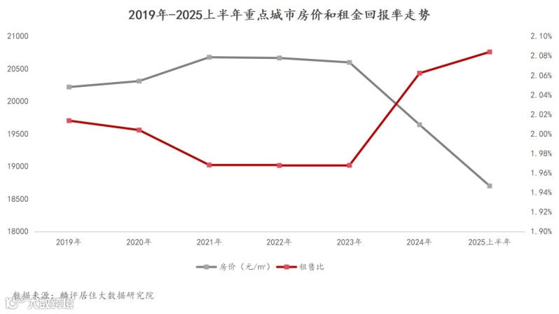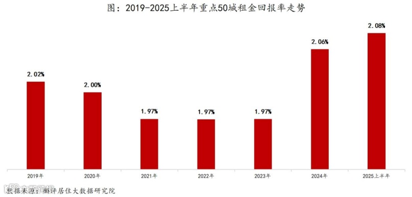 2025上半年租金回报率微升,居民租房收益预期位居高位。根据麟评居住大数据研究院监测数据显示,2025年重点50城租金回报率为2.08%,继续创新高,并较2024年上升0.02个百分点。2025上半年,房价和租金均在调整阶段,房价下行预期大于租金下行预期,带动租金回报率上升,租房的收益预期相应提升在预期之内。
