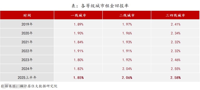 租金回报率呈一线城市<二线城市<三四线城市。分等级城市来看,2025上半年一线城市租金回报率为1.85%,较2024年上升0.03个百分点;二线城市租金回报率为2.06%,较2024年上升0.02个百分点;三四线城市租金回报率为2.58%,较2024年上升0.3个百分点。