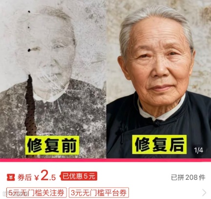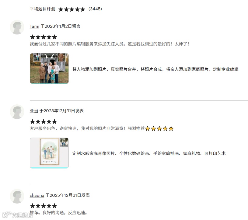 - 契合用户情感需求:Etsy核心用户以高收入女性为主,重视家庭记忆与情感价值。老照片修复满足了她们对“传承”和“纪念”的深层心理诉求。