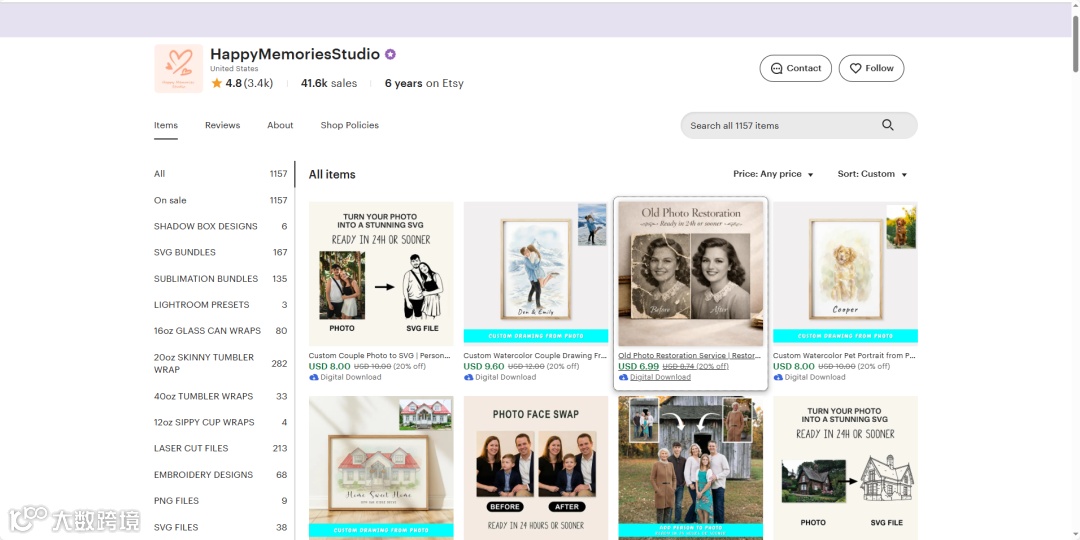 Etsy平台上,一家名为HappyMemoriesStudio的真实店铺,凭借“数字定制+情感附加值”的定位,将“老照片修复”这一小众服务做成了出海爆款生意。目前月订单超500单,客单价9美元,无物流压力,复购率高,展现出强劲的商业潜力。
