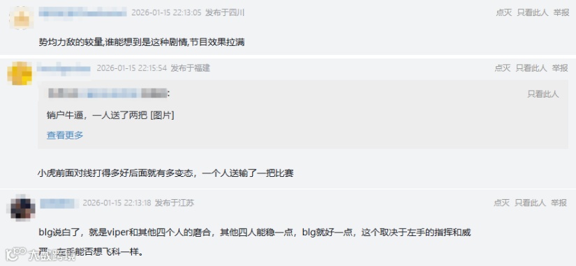 对于这场比赛,网友则表示:“势均力敌的较量,谁能想到是这种剧情,节目效果拉满”、“小虎前面对线打得多好后面就有多变态,一个人送输了一把比赛”、“BLG说白了,就是viper和其他四个人的磨合,其他四人能稳一点,BLG就好一点,这个取决于左手的指挥和威严,左手能否像Faker一样”。