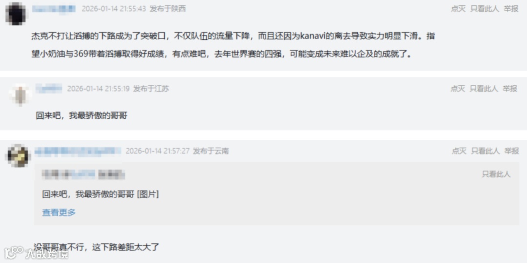对此,网友表示:“杰克不打让滔搏的下路成为了突破口,不仅队伍的流量下降,而且还因为kanavi的离去导致实力明显下滑。指望小奶油与369带着滔搏取得好成绩,有点难吧,去年世界赛的四强,可能变成未来难以企及的成就了”、“回来吧,我最骄傲的哥哥”、“没哥哥真不行,这下路差距太大了”。