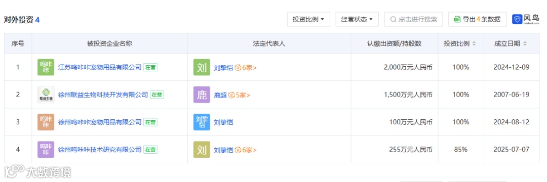 公开资料显示,江苏呜咔咔宠物用品有限公司成立于2024年,是上海鑫呜咔生物科技发展有限公司 (国内新型植物猫砂龙头企业) 为投资建设徐州猫砂工厂而专门设立的项目公司。公司注册资本2000万元。