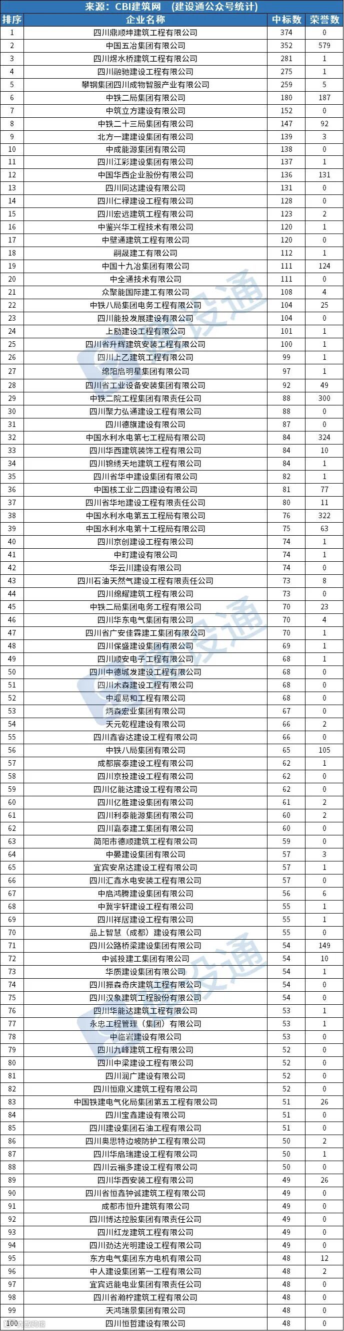 分列四川省建筑施工企业中标数量排行榜前三位。
