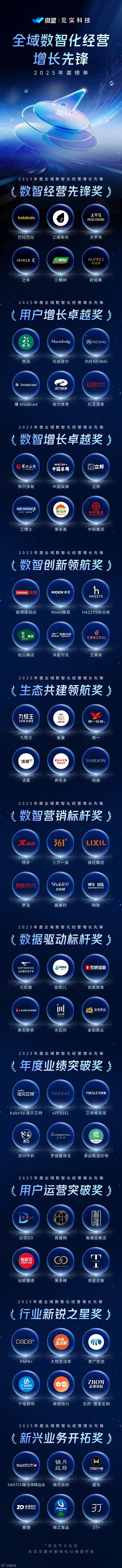 就在近日,微盟和见实一起联合发布了2025年度全域数智化经营增长先锋榜单,包括柒牌、红豆居家、巴拉巴拉、361°、摩恩、立邦、七匹狼、哈森等诸多品牌上榜。在评定案例时,行业专家和业内观察团认为,这些品牌值得业内参考对标,获奖品牌的数据还包括: