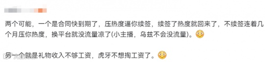 对此,网友觉得有两个可能,一个是Uzi直播合同快到期了,平台故意压热度吓主播逼他签约;另一个是Uzi的基本工资太高,但直播间拿到的礼物钱又确实很少,所以虎牙想要找点理由来扣工资。当然,也不排除这个统计数据出错,实际数据是对的情况。