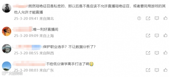 这项新规一出,网友纷纷表示V社这招太狠了:“既然冠绝征召是私密的,那以后是不是应该不允许直播冠绝征召,或者要同局游戏的其他人允许才能直播”,“说句奶黑不爱听的,奶哥的录像真要卖5000了”,“惊天噩耗!不让低分段玩家学高分段打法了”……