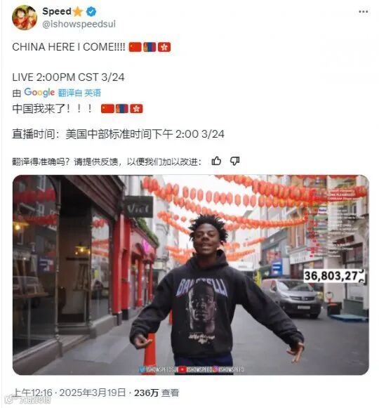 日前,美国知名YouTuber IShowSpeed(“甲亢哥”)宣布将于 2025 年3月24日来华,并进行直播。在此前直播中,他透露此行最想见的人是大张伟老师:“I try na meet Da Zhang Wei bro.”