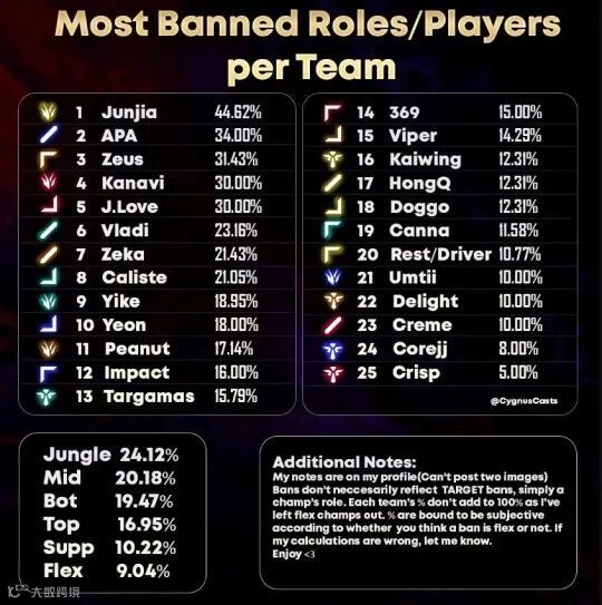 作为首届采用全局BP的国际赛事,全球先锋赛的各个参赛队伍,都需要面临BP上的巨大压力,对选手英雄池的考验也更强了。对此,外网就统计了一组特殊的数据——各队选手抗Ban位比例。