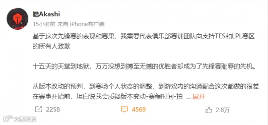 日前,TES的经理郭皓就发布了微博长文致歉。他在向粉丝和观众道歉、回应选手状态之余,也对自己进行了处罚。同时还立下“军令状”: