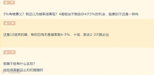 所以,很多玩家都有怨言:“还是10倍来的爽,有的白鸡本身掉率就4-5%,十倍,就去2-3次就必出”,“5%有啥意义?我还以为掉率很高呢?4周相当于就给你4次5%的机会,脸黑的不还是一样吗”,“不知道我28个满级号够不够用”……