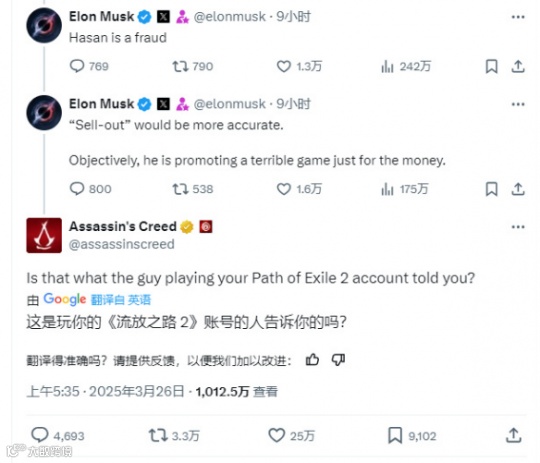 而一石掀起千层浪,这番话很快也引来了《刺客信条:影》官推账号的关注,后者攻击性十足的回复马斯克:“这是那个帮你玩《流放之路2》账号的人告诉你的吗?”