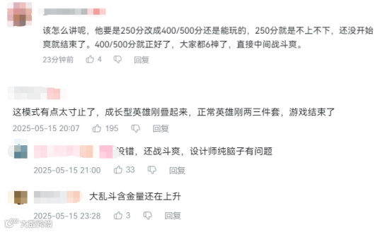 对此,很多网友也是无法理解设计师的思路:“要砍掉防御套,战斗爽的话,为啥不加快装备成型的速度,让大家一出门就带着两三件装备去打架。又或说,你要追求策略性的话,那为什么不能把250分改成400/500分,这样才有后期装备成型后的博弈空间”。