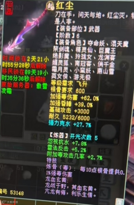 底子加强毒伤害62,炼化蓝字强力克水27.7,特技炼骨(毒),目前就差炼器毕业,大家知道这是哪位大佬的武器么?