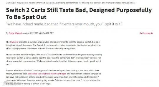 近期,任天堂开发者堂田卓宏接受GameSpot采访时确认,Switch2卡带依然会延续Switch的工艺,添加超级强烈的苦味剂,因此尝起来也还是苦的。
