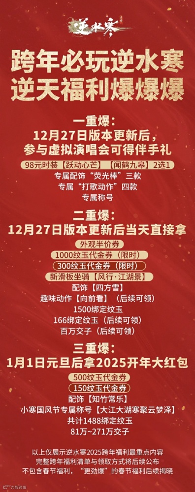 在虚拟演唱会之外,《逆水寒手游》于12月27日所带来的海量跨年福利,同样是能令人挪不开眼的重头戏!