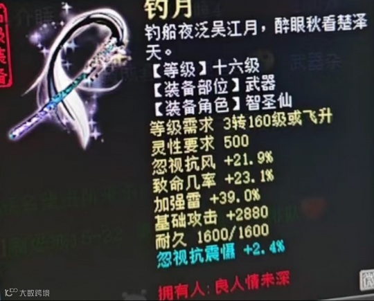 十六级武器,底子忽视抗风21.9,加强雷39,很差......但蓝字又有忽视抗震慑2.4,真是“不会风法的女仙不是好魔”啊,看得人太难受了!